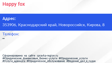 Happy fox по адресу 353906, Краснодарский край, Новороссийск, Кирова, 8 в дальнейшем Организация, размещена в следующих категориях: