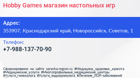 Hobby Games, магазин настольных игр по адресу 353907, Краснодарский край, Новороссийск, Советов, 1 в дальнейшем Организация, размещена в следующих категориях: