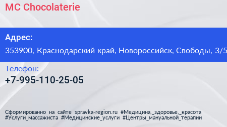 MC Chocolaterie по адресу 353900, Краснодарский край, Новороссийск, Свободы, 3/5 в дальнейшем Организация, размещена в следующих категориях:
