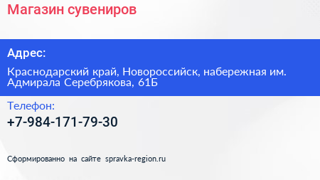 Магазин сувениров по адресу Краснодарский край, Новороссийск, набережная им. Адмирала Серебрякова, 61Б в дальнейшем Организация, размещена в следующих категориях: