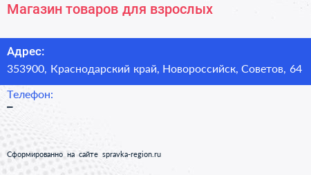 Магазин товаров для взрослых по адресу 353900, Краснодарский край, Новороссийск, Советов, 64 в дальнейшем Организация, размещена в следующих категориях: