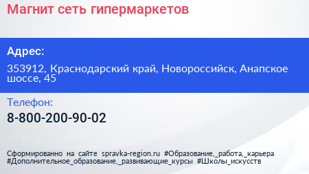 Магнит, сеть гипермаркетов по адресу 353912, Краснодарский край, Новороссийск, Анапское шоссе, 45 в дальнейшем Организация, размещена в следующих категориях:
