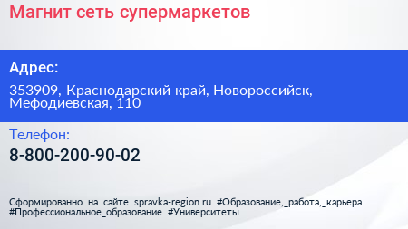 Магнит, сеть супермаркетов по адресу 353909, Краснодарский край, Новороссийск, Мефодиевская, 110 в дальнейшем Организация, размещена в следующих категориях: