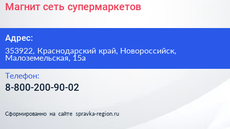 Магнит, сеть супермаркетов по адресу 353922, Краснодарский край, Новороссийск, Малоземельская, 15а в дальнейшем Организация, размещена в следующих категориях: