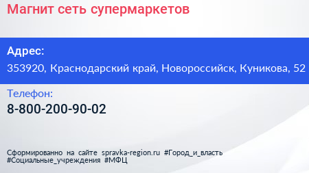 Магнит, сеть супермаркетов по адресу 353920, Краснодарский край, Новороссийск, Куникова, 52 в дальнейшем Организация, размещена в следующих категориях: