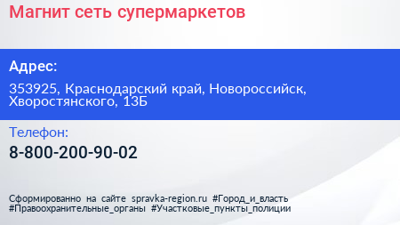 Магнит, сеть супермаркетов по адресу 353925, Краснодарский край, Новороссийск, Хворостянского, 13Б в дальнейшем Организация, размещена в следующих категориях: