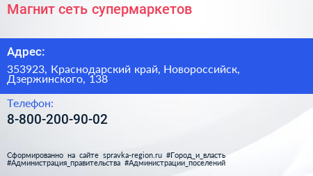 Магнит, сеть супермаркетов по адресу 353923, Краснодарский край, Новороссийск, Дзержинского, 138 в дальнейшем Организация, размещена в следующих категориях: