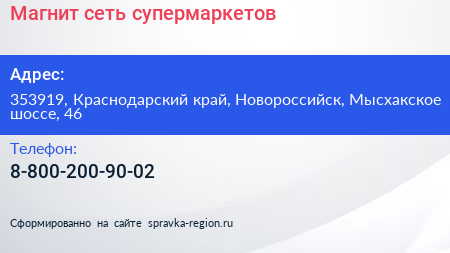 Магнит, сеть супермаркетов по адресу 353919, Краснодарский край, Новороссийск, Мысхакское шоссе, 46 в дальнейшем Организация, размещена в следующих категориях: