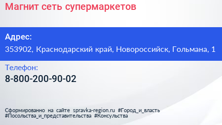 Магнит, сеть супермаркетов по адресу 353902, Краснодарский край, Новороссийск, Гольмана, 1 в дальнейшем Организация, размещена в следующих категориях: