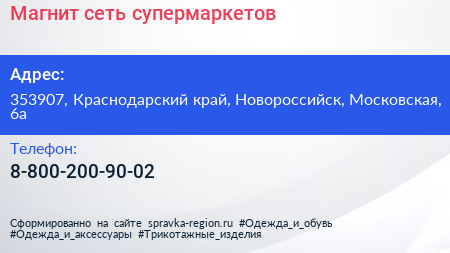 Магнит, сеть супермаркетов по адресу 353907, Краснодарский край, Новороссийск, Московская, 6а в дальнейшем Организация, размещена в следующих категориях: