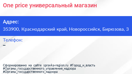 One price, универсальный магазин по адресу 353900, Краснодарский край, Новороссийск, Бирюзова, 3 в дальнейшем Организация, размещена в следующих категориях: