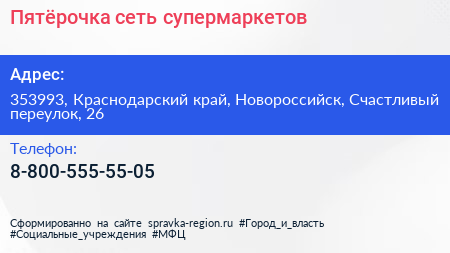 Пятёрочка, сеть супермаркетов по адресу 353993, Краснодарский край, Новороссийск, Счастливый переулок, 26 в дальнейшем Организация, размещена в следующих категориях:
