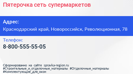 Пятерочка, сеть супермаркетов по адресу Краснодарский край, Новороссийск, Революционная, 78 в дальнейшем Организация, размещена в следующих категориях: