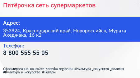 Пятёрочка, сеть супермаркетов по адресу 353924, Краснодарский край, Новороссийск, Мурата Ахеджака, 16 к2 в дальнейшем Организация, размещена в следующих категориях: