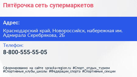 Пятёрочка, сеть супермаркетов по адресу Краснодарский край, Новороссийск, набережная им. Адмирала Серебрякова, 2Б в дальнейшем Организация, размещена в следующих категориях: