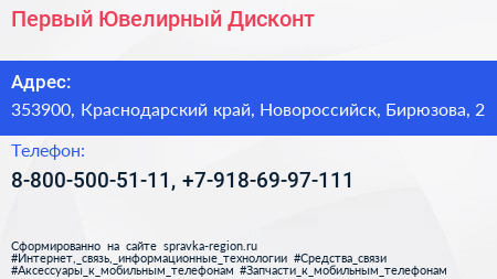 Первый Ювелирный Дисконт по адресу 353900, Краснодарский край, Новороссийск, Бирюзова, 2 в дальнейшем Организация, размещена в следующих категориях: