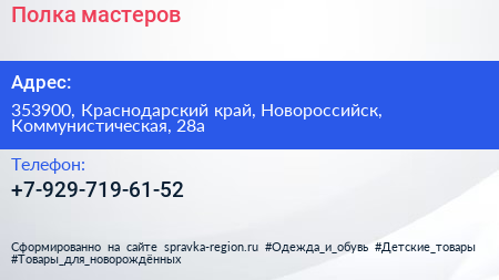 Полка мастеров по адресу 353900, Краснодарский край, Новороссийск, Коммунистическая, 28а в дальнейшем Организация, размещена в следующих категориях: