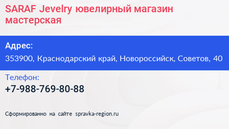 SARAF Jevelry, ювелирный магазин-мастерская по адресу 353900, Краснодарский край, Новороссийск, Советов, 40 в дальнейшем Организация, размещена в следующих категориях:
