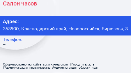Салон часов по адресу 353900, Краснодарский край, Новороссийск, Бирюзова, 3 в дальнейшем Организация, размещена в следующих категориях: