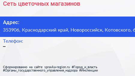 Сеть цветочных магазинов по адресу 353906, Краснодарский край, Новороссийск, Котовского, 6 в дальнейшем Организация, размещена в следующих категориях: