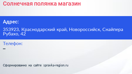 Солнечная полянка, магазин по адресу 353923, Краснодарский край, Новороссийск, Снайпера Рубахо, 42 в дальнейшем Организация, размещена в следующих категориях: