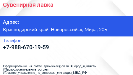 Сувенирная лавка по адресу Краснодарский край, Новороссийск, Мира, 20Б в дальнейшем Организация, размещена в следующих категориях: