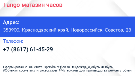Tango, магазин часов по адресу 353900, Краснодарский край, Новороссийск, Советов, 28 в дальнейшем Организация, размещена в следующих категориях: