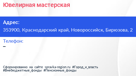 Ювелирная мастерская по адресу 353900, Краснодарский край, Новороссийск, Бирюзова, 2 в дальнейшем Организация, размещена в следующих категориях: