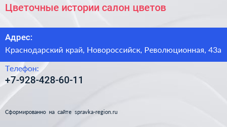 Цветочные истории, салон цветов по адресу Краснодарский край, Новороссийск, Революционная, 43а в дальнейшем Организация, размещена в следующих категориях: