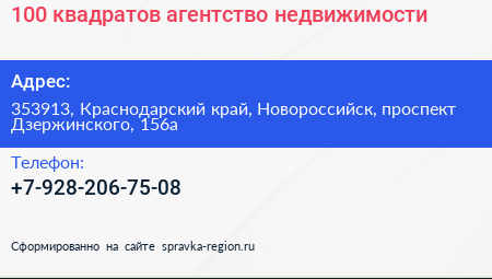 100 квадратов, агентство недвижимости по адресу 353913, Краснодарский край, Новороссийск, проспект Дзержинского, 156а в дальнейшем Организация, размещена в следующих категориях: