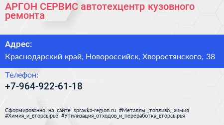 АРГОН СЕРВИС, автотехцентр кузовного ремонта по адресу Краснодарский край, Новороссийск, Хворостянского, 38 в дальнейшем Организация, размещена в следующих категориях: