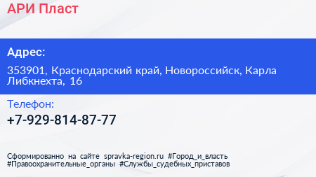 АРИ-Пласт по адресу 353901, Краснодарский край, Новороссийск, Карла Либкнехта, 16 в дальнейшем Организация, размещена в следующих категориях:
