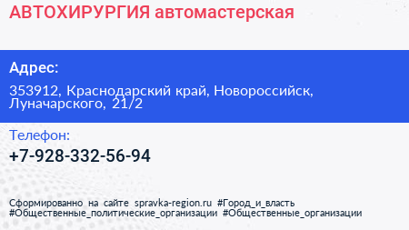 АВТОХИРУРГИЯ, автомастерская по адресу 353912, Краснодарский край, Новороссийск, Луначарского, 21/2 в дальнейшем Организация, размещена в следующих категориях:
