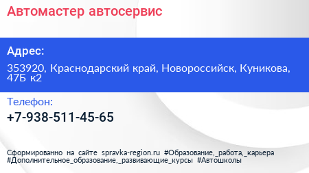 Автомастер, автосервис по адресу 353920, Краснодарский край, Новороссийск, Куникова, 47Б к2 в дальнейшем Организация, размещена в следующих категориях: