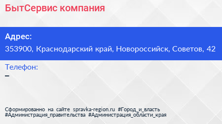 БытСервис, компания по адресу 353900, Краснодарский край, Новороссийск, Советов, 42 в дальнейшем Организация, размещена в следующих категориях: