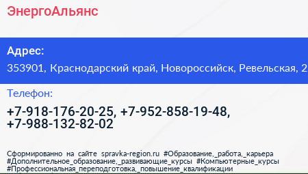 ЭнергоАльянс по адресу 353901, Краснодарский край, Новороссийск, Ревельская, 2 в дальнейшем Организация, размещена в следующих категориях: