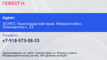 ГЕФЕСТ-Н по адресу 353907, Краснодарский край, Новороссийск, Луначарского, 21 в дальнейшем Организация, размещена в следующих категориях: