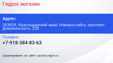 Гидрос, магазин по адресу 353924, Краснодарский край, Новороссийск, проспект Дзержинского, 232 в дальнейшем Организация, размещена в следующих категориях: