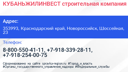 КУБАНЬЖИЛИНВЕСТ, строительная компания по адресу 353993, Краснодарский край, Новороссийск, Шоссейная, 23 в дальнейшем Организация, размещена в следующих категориях: