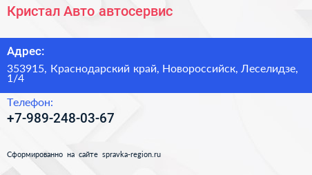 Кристал Авто, автосервис по адресу 353915, Краснодарский край, Новороссийск, Леселидзе, 1/4 в дальнейшем Организация, размещена в следующих категориях: