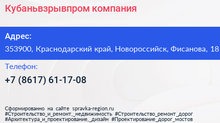 Кубаньвзрывпром, компания по адресу 353900, Краснодарский край, Новороссийск, Фисанова, 18 в дальнейшем Организация, размещена в следующих категориях: