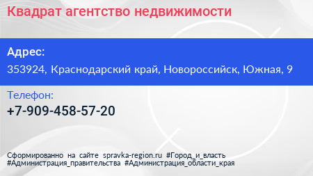 Квадрат, агентство недвижимости по адресу 353924, Краснодарский край, Новороссийск, Южная, 9 в дальнейшем Организация, размещена в следующих категориях: