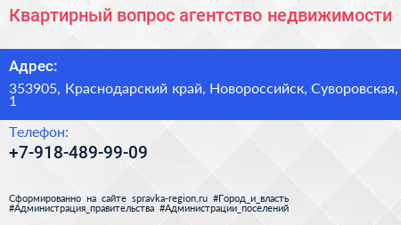 Квартирный вопрос, агентство недвижимости по адресу 353905, Краснодарский край, Новороссийск, Суворовская, 1 в дальнейшем Организация, размещена в следующих категориях: