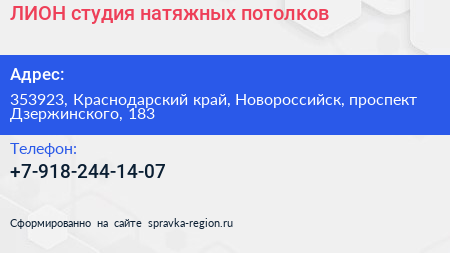 ЛИОН, студия натяжных потолков по адресу 353923, Краснодарский край, Новороссийск, проспект Дзержинского, 183 в дальнейшем Организация, размещена в следующих категориях: