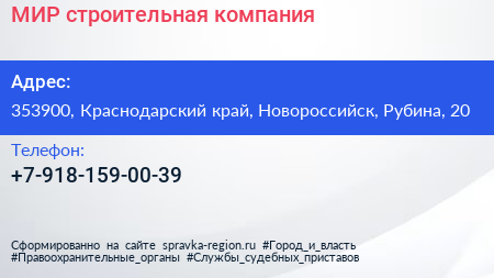 МИР, строительная компания по адресу 353900, Краснодарский край, Новороссийск, Рубина, 20 в дальнейшем Организация, размещена в следующих категориях: