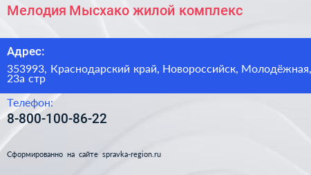 Мелодия Мысхако, жилой комплекс по адресу 353993, Краснодарский край, Новороссийск, Молодёжная, 23а стр в дальнейшем Организация, размещена в следующих категориях:
