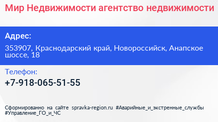 Мир Недвижимости, агентство недвижимости по адресу 353907, Краснодарский край, Новороссийск, Анапское шоссе, 18 в дальнейшем Организация, размещена в следующих категориях: