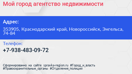 Мой город, агентство недвижимости по адресу 353905, Краснодарский край, Новороссийск, Энгельса, 74-84 в дальнейшем Организация, размещена в следующих категориях: