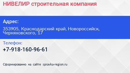 НИВЕЛИР, строительная компания по адресу 353905, Краснодарский край, Новороссийск, Черняховского, 17 в дальнейшем Организация, размещена в следующих категориях: