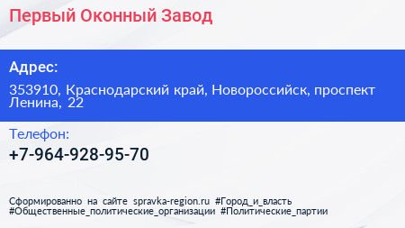 Первый Оконный Завод по адресу 353910, Краснодарский край, Новороссийск, проспект Ленина, 22 в дальнейшем Организация, размещена в следующих категориях:
